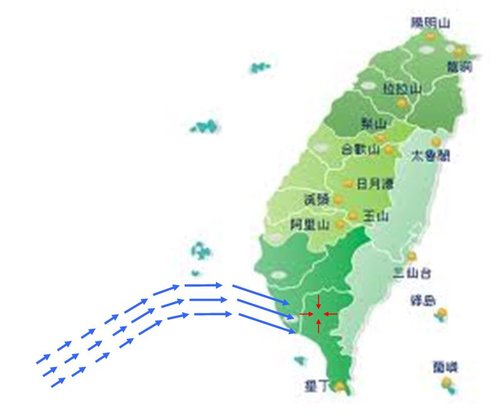 因為對流造成近岸風場侷域增強, 科氏加速度的量值大小為2(所在位置的地球自轉角速度分量)(風速), 所以風速越快科氏力越大, 造成風向偏轉