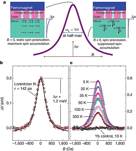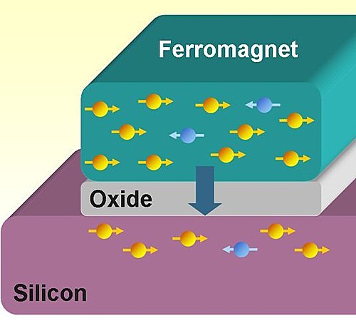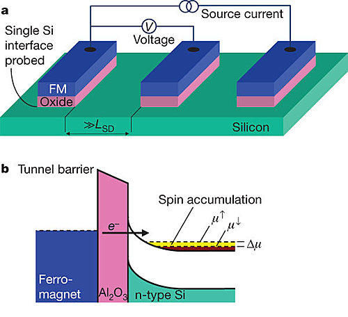 荷蘭特文特大學(University of Twente)的研究人員報告說,他們在實驗中發現,只要在半導體矽片和磁性材料之間插入厚度不到1奈米的氧化鋁薄膜,再施加一個電場,那麼自旋極化的電子就會從磁性材料向矽片移動,氧化鋁薄膜會起到篩檢程式的作用,只有某個特定自旋狀態的電子能夠通過,從而在室溫下使有序的電子自旋極化狀態體現在矽片中。(來源:新華網 黃堃)